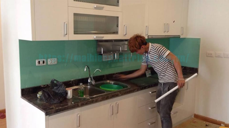 Thợ thi công giá kính ốp bếp màu xanh ngọc có tay nghề giỏi – thâm niên – rất tỉ mĩ – nhiệt tình
